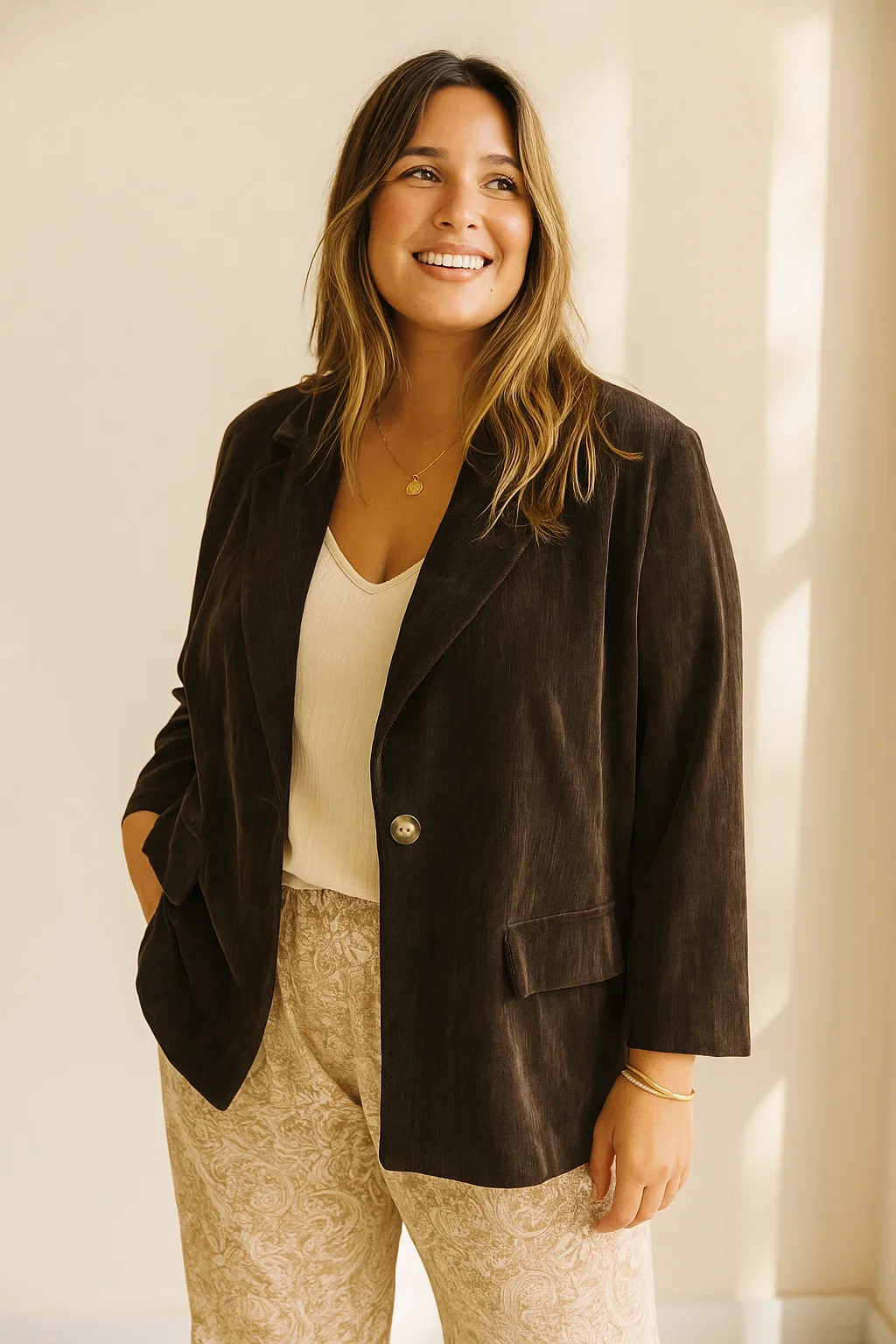 Dotée d’un col tailleur classique, d’une fermeture à un bouton et de deux poches plaquées, cette veste affiche un look intemporel. Le velours, matière phare de la saison, capte la lumière et ajoute une note raffinée à toutes vos tenues. Elle se décline en deux coloris essentiels — chocolat profond et noir élégant — pour s’accorder à toutes vos envies.
