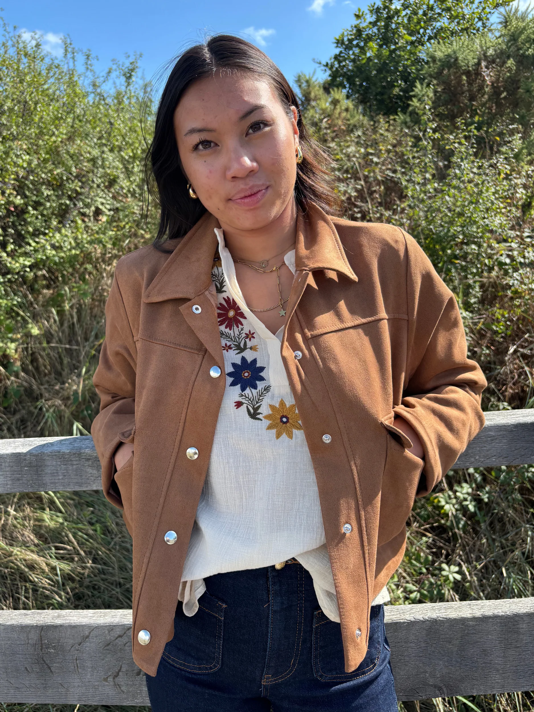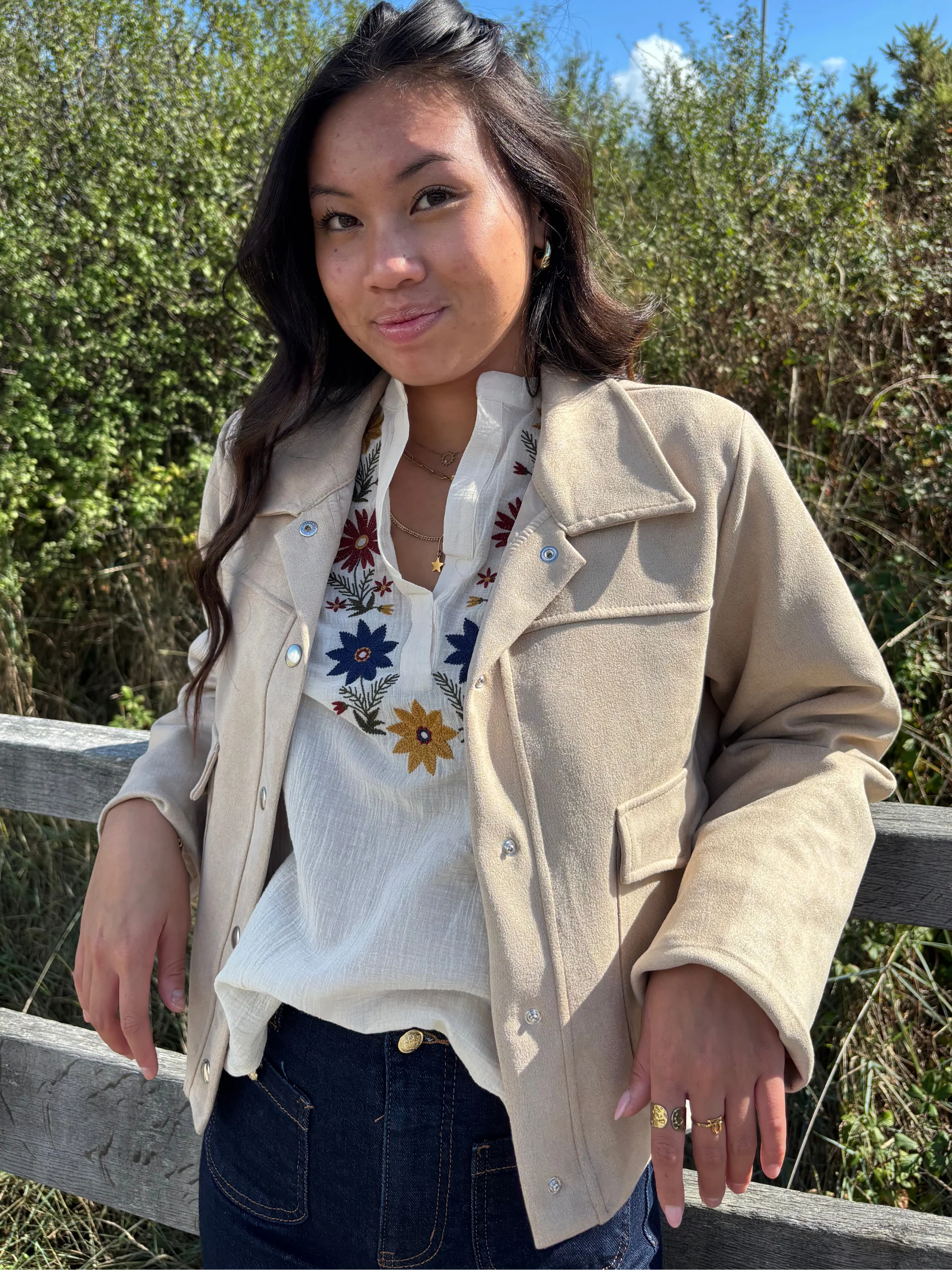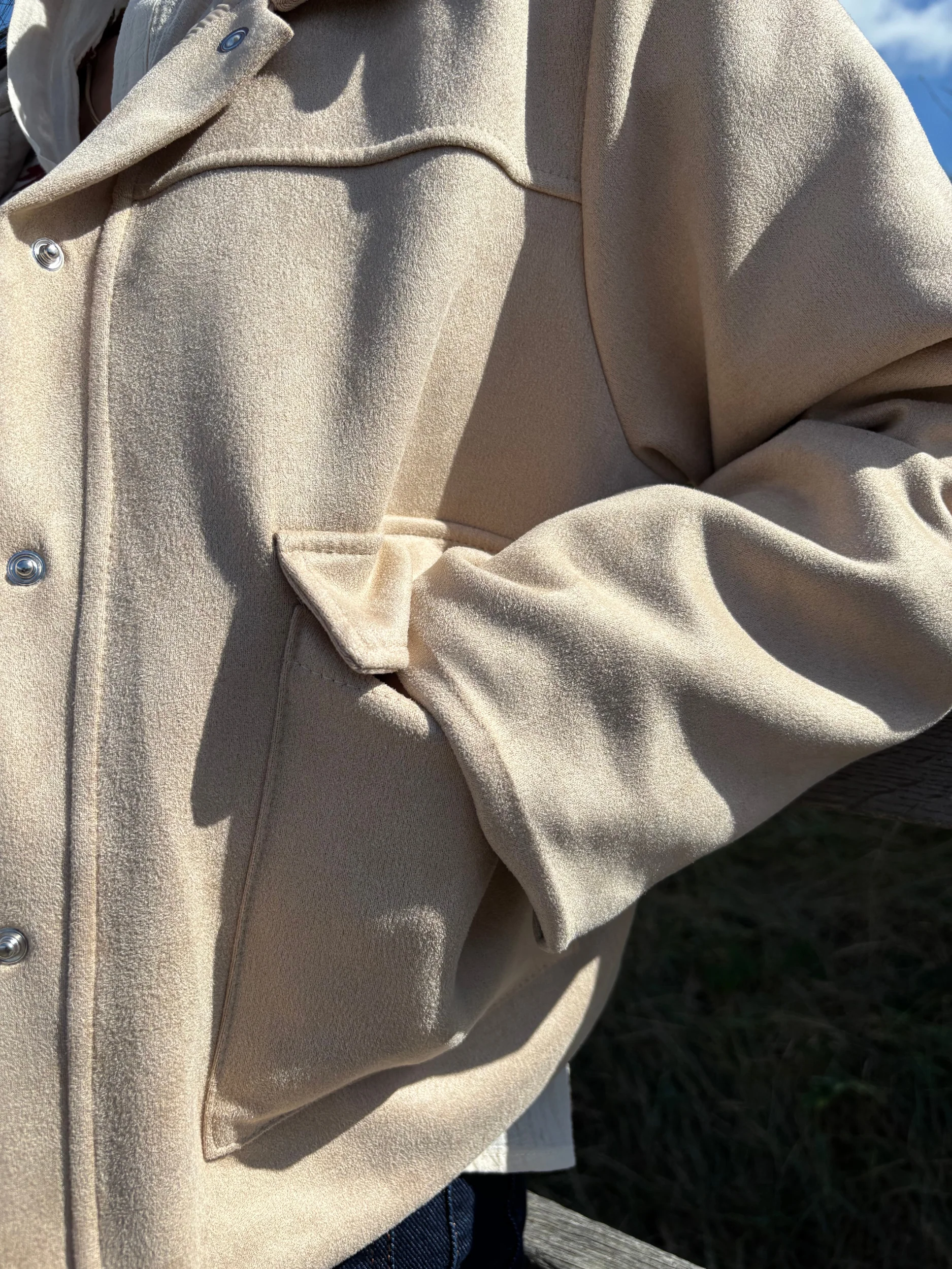 Cette veste se distingue par ses poches plaquées à rabat et sa fermeture par boutons pression qui ajoutent du style tout en restant fonctionnels. Son col chemise structuré lui confère une allure chic et polyvalente, parfaite pour un look casual comme plus habillé.