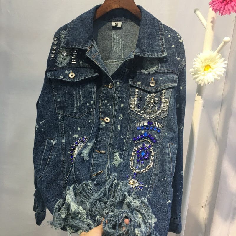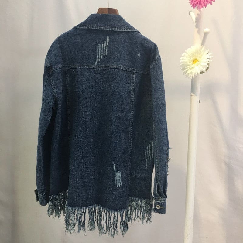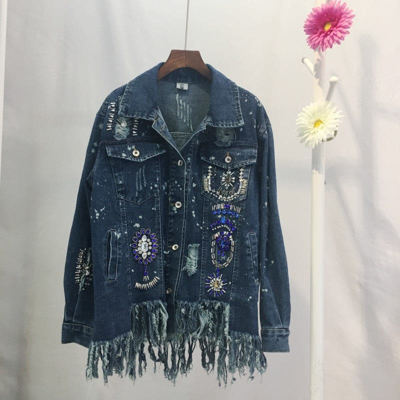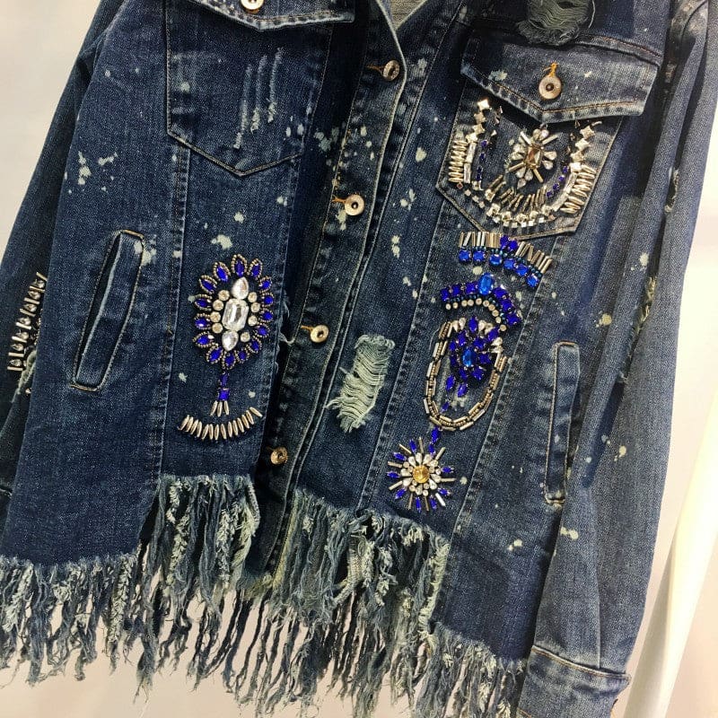Veste en jeans aspect usée et effilochée dans le bas. Avec manches longues terminées par un poignet, deux poches appliquées à rabat au niveau poitrine. Poches passepoilées. Perles cousues en forme de fleurs sur l’avant. Portez le bohème et vous respirerez le bonheur !