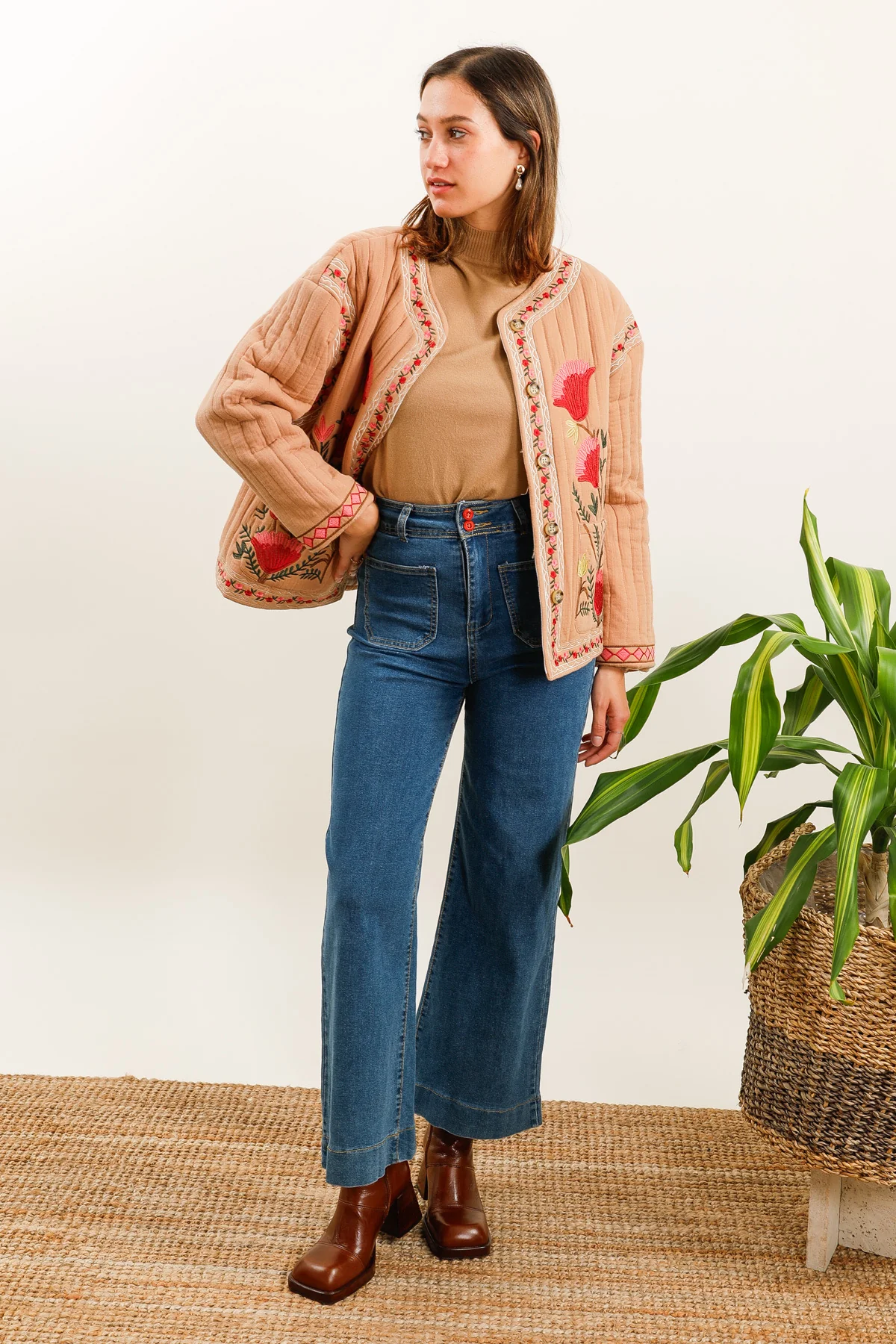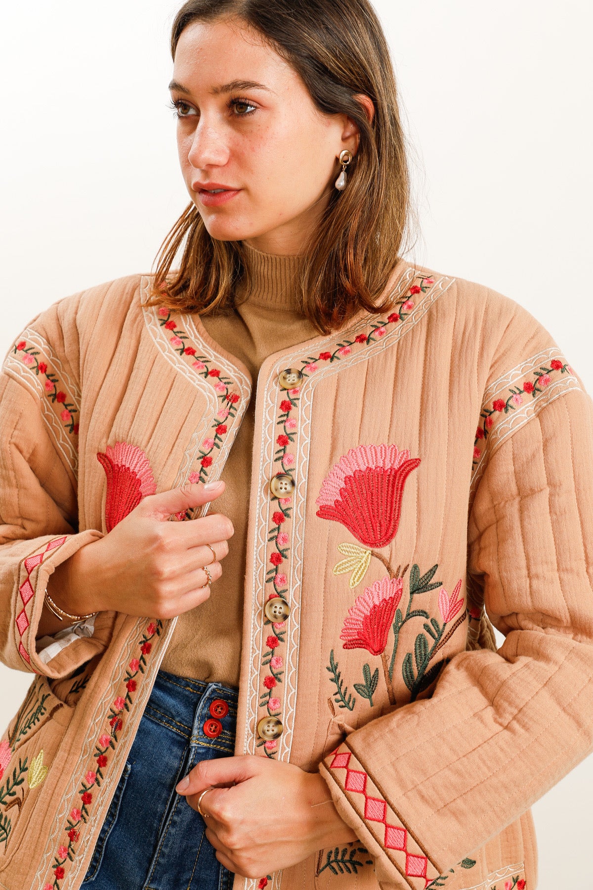 Cette veste matelassée brodée en coton est une véritable pièce coup de cœur. Ses broderies florales colorées et ses finitions artisanales lui confèrent un charme bohème irrésistible. Confortable et légère, elle est idéale pour la mi-saison et apporte une touche de couleur et de douceur à vos tenues.