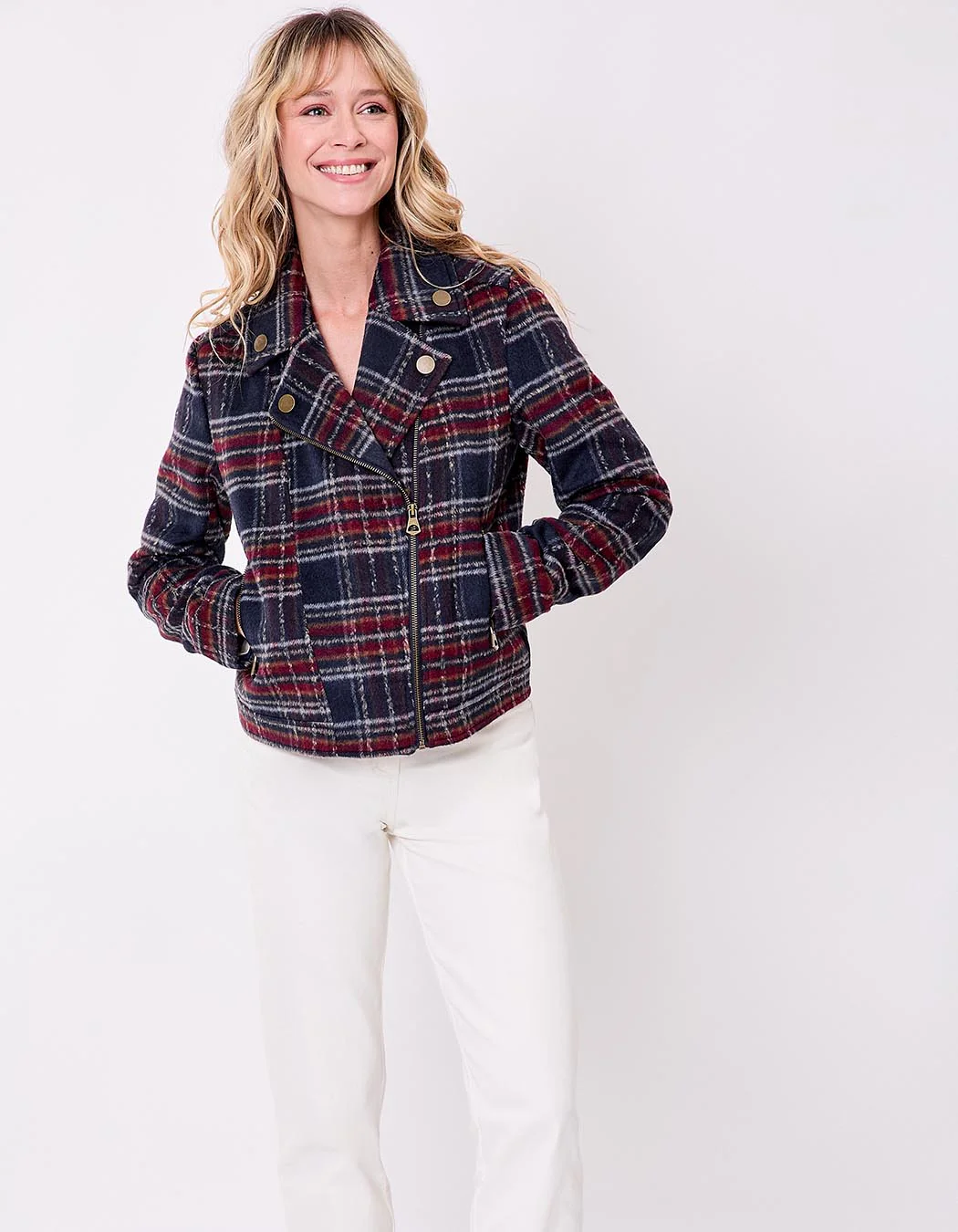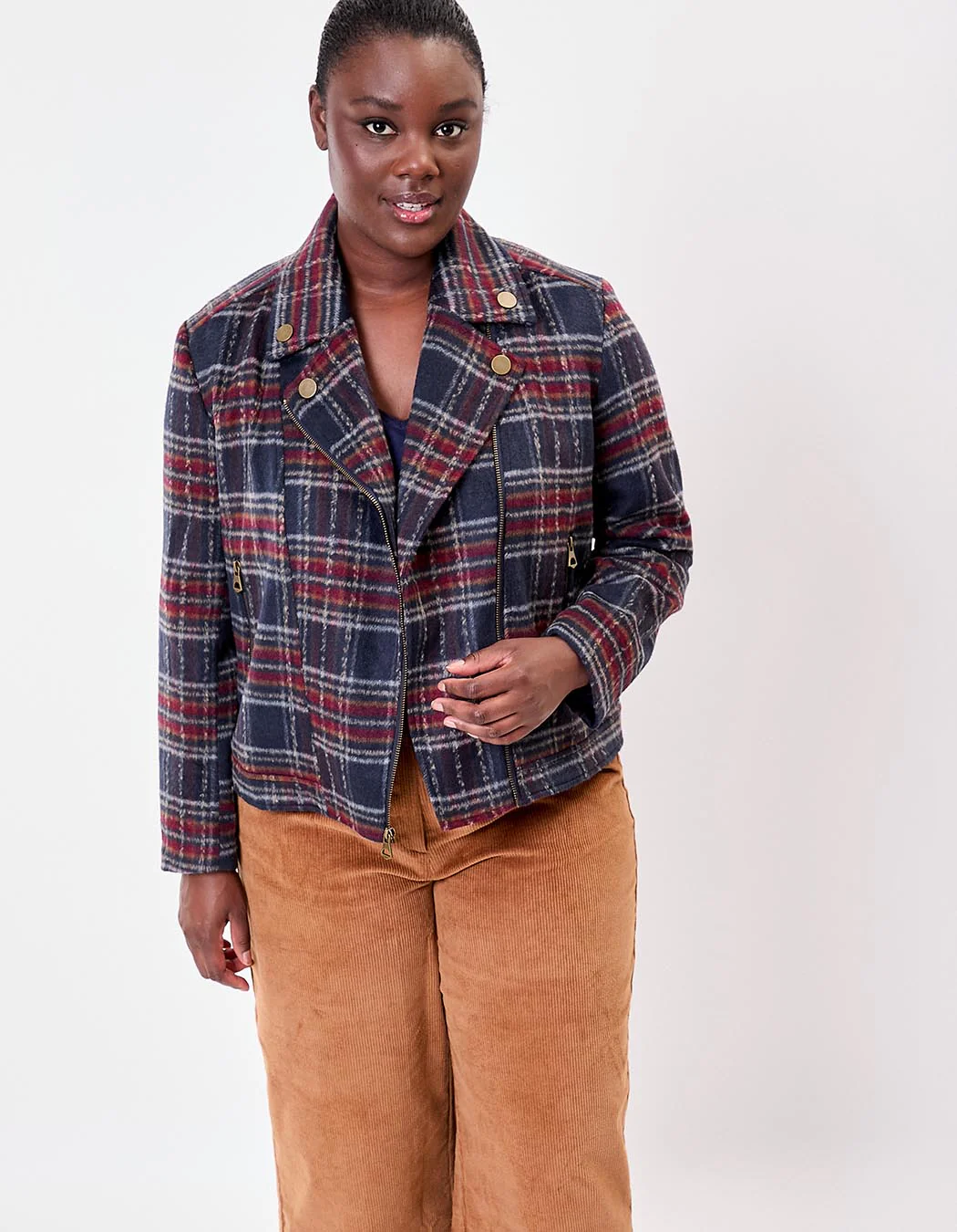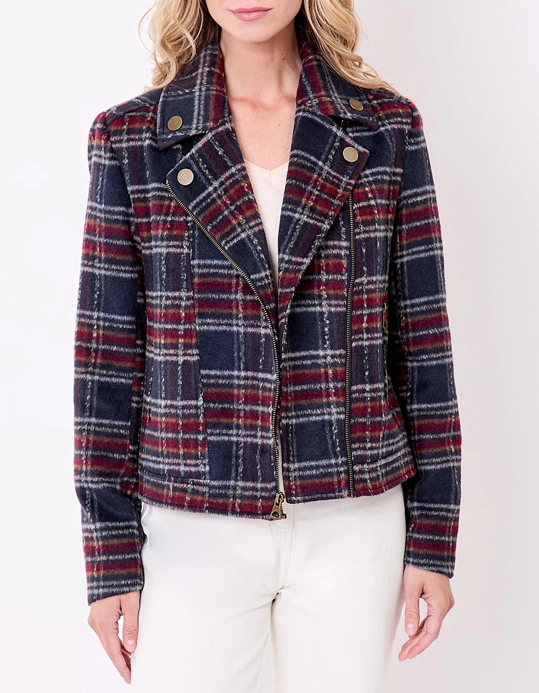 Idéale pour une allure citadine, cette veste peut se porter avec un jean slim et des bottines ou sur une robe fluide pour jouer sur les contrastes. Son imprimé à carreaux rouges et marines s’accorde parfaitement aux teintes de saison.