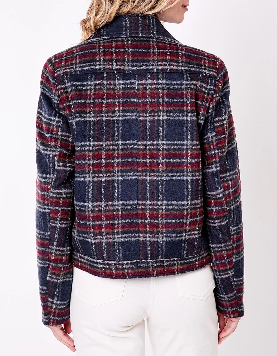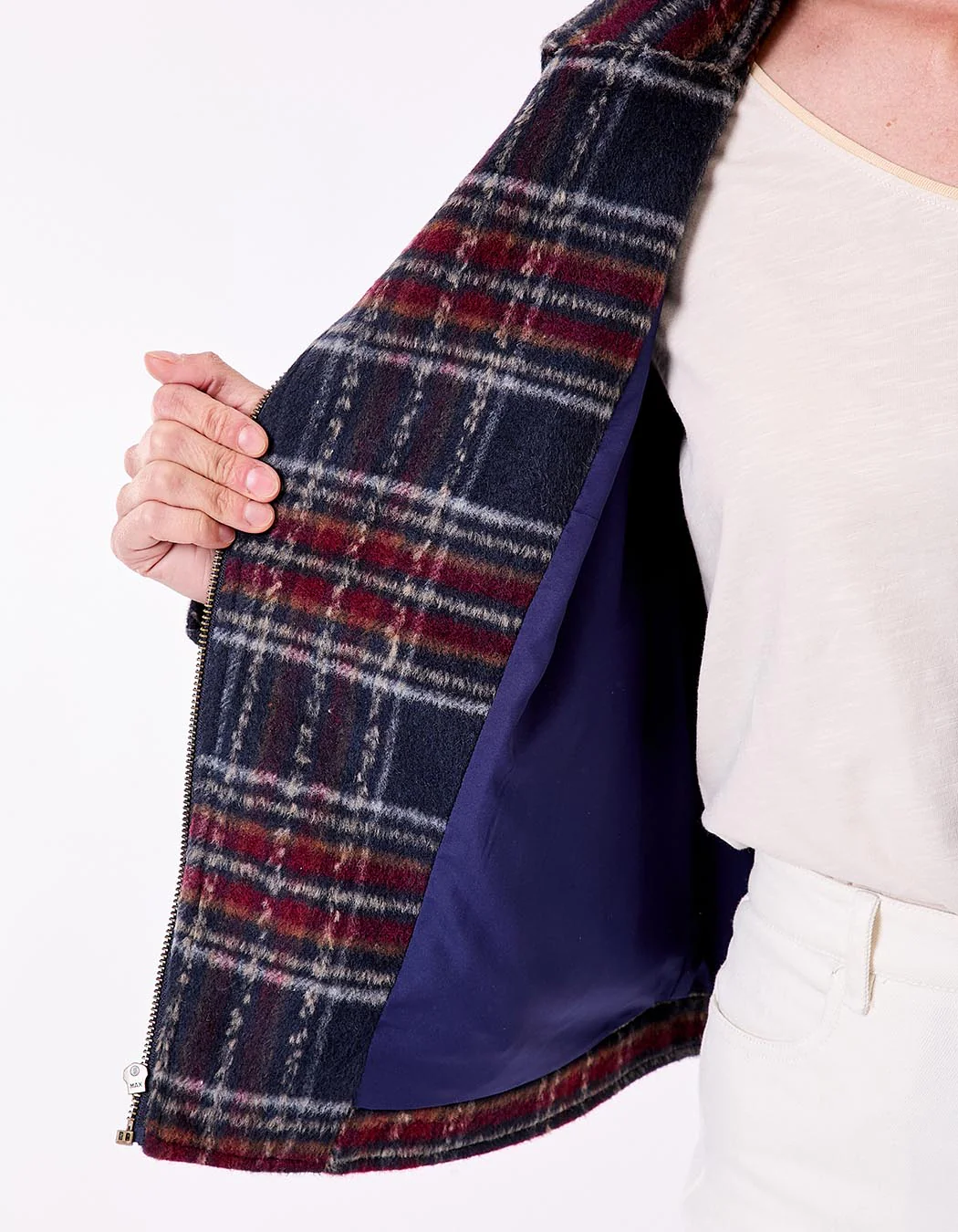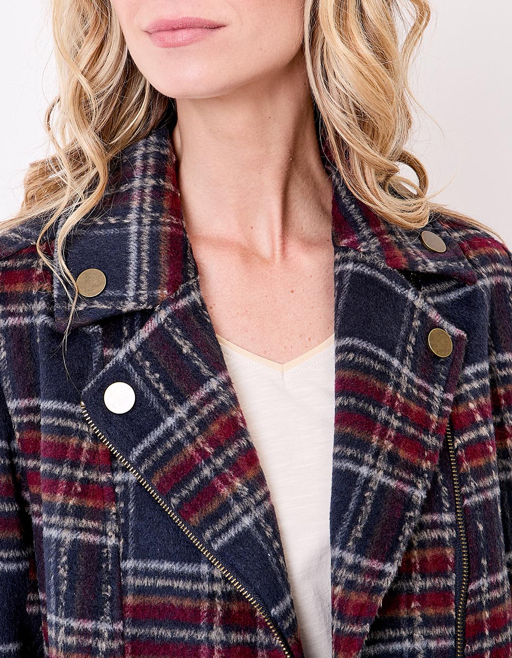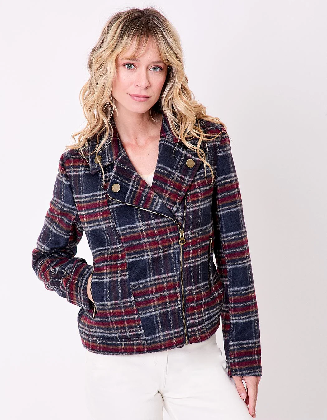 Idéale pour une allure citadine, cette veste peut se porter avec un jean slim et des bottines ou sur une robe fluide pour jouer sur les contrastes. Son imprimé à carreaux rouges et marines s’accorde parfaitement aux teintes de saison.