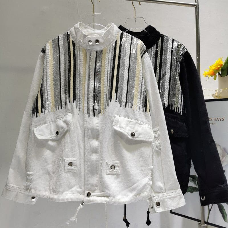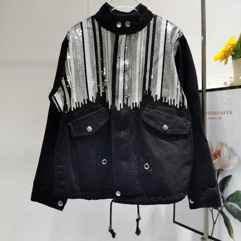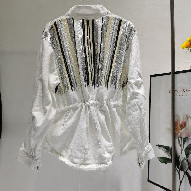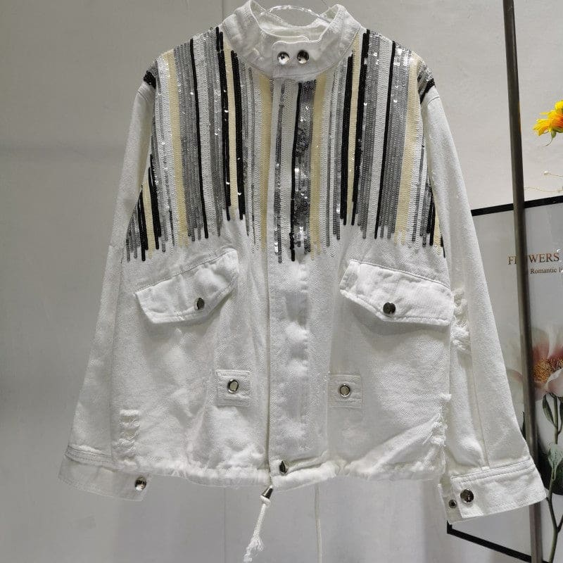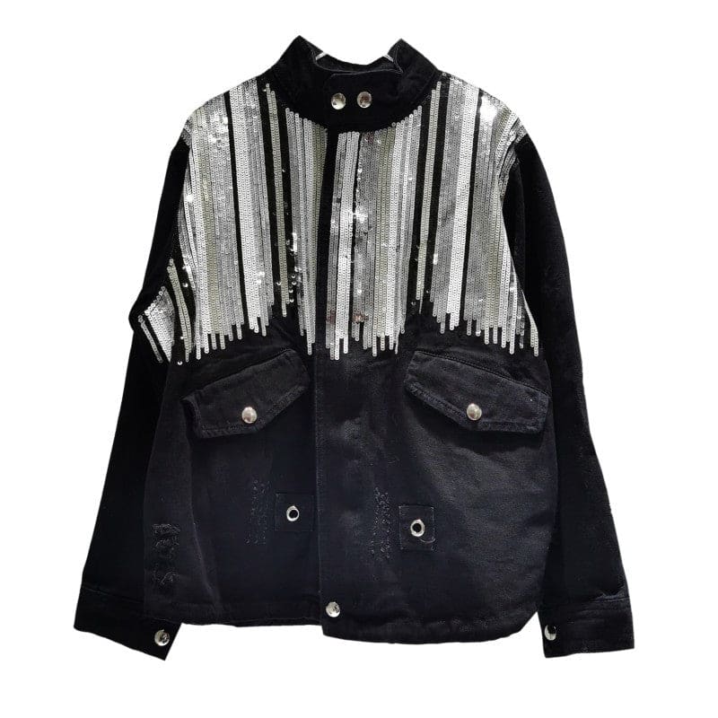 Veste en jeans avec poches appliquées à l’avant. Boutonnage à l’avant et col montant. Manches longues terminées par un poignet. Sur l’empiècement dos et devant se trouve des paillettes argentées et dorées. Chic bohème pour les évènements importants de la vie !
