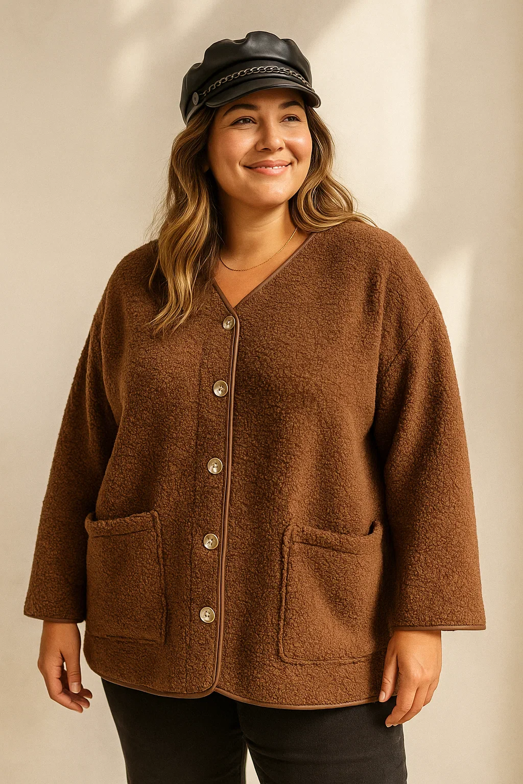Disponible en taille unique (du 44 au 50), cette veste s’adapte parfaitement aux morphologies généreuses. Son col en V, ses grands boutons nacrés et ses poches plaquées pratiques soulignent son design à la fois simple et élégant. Sa texture douce garde la chaleur tout en restant respirante.