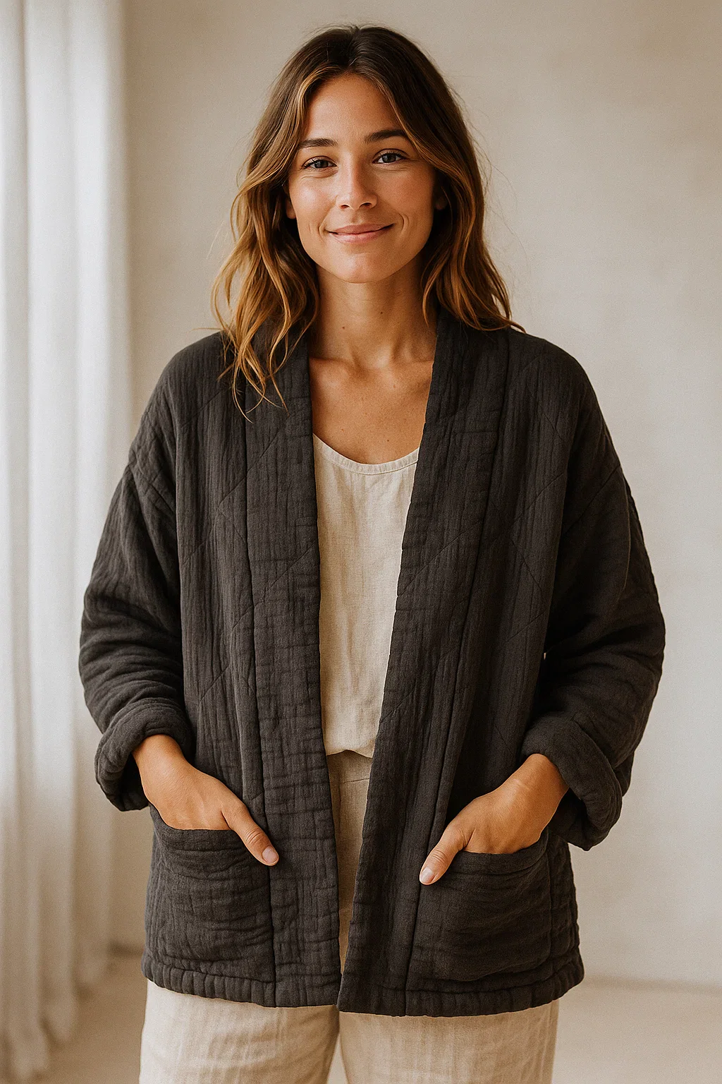 Facile à associer, elle se porte aussi bien sur un pantalon en toile qu’une robe longue fluide. Cette veste est pensée pour une femme moderne, naturelle, qui aime se sentir à l’aise tout en affirmant son style.