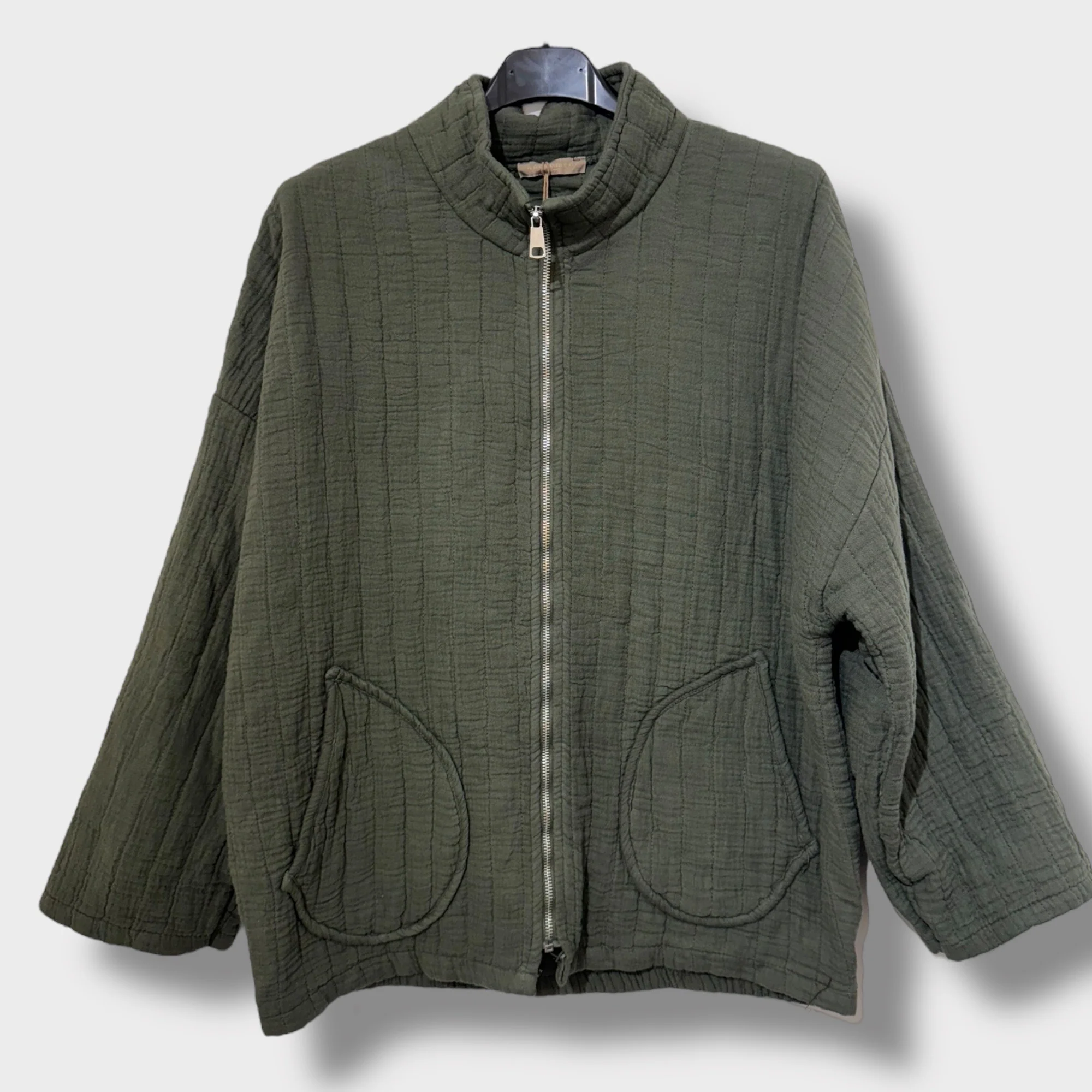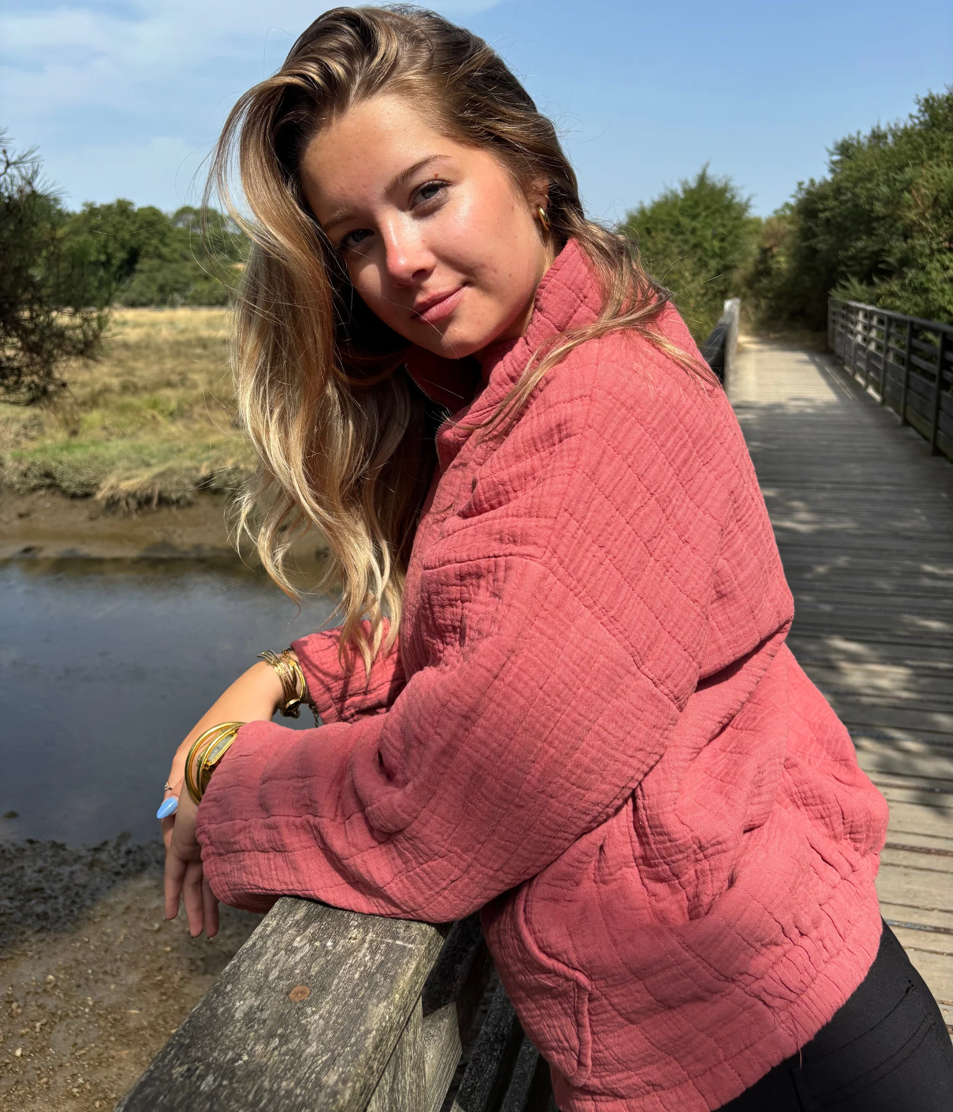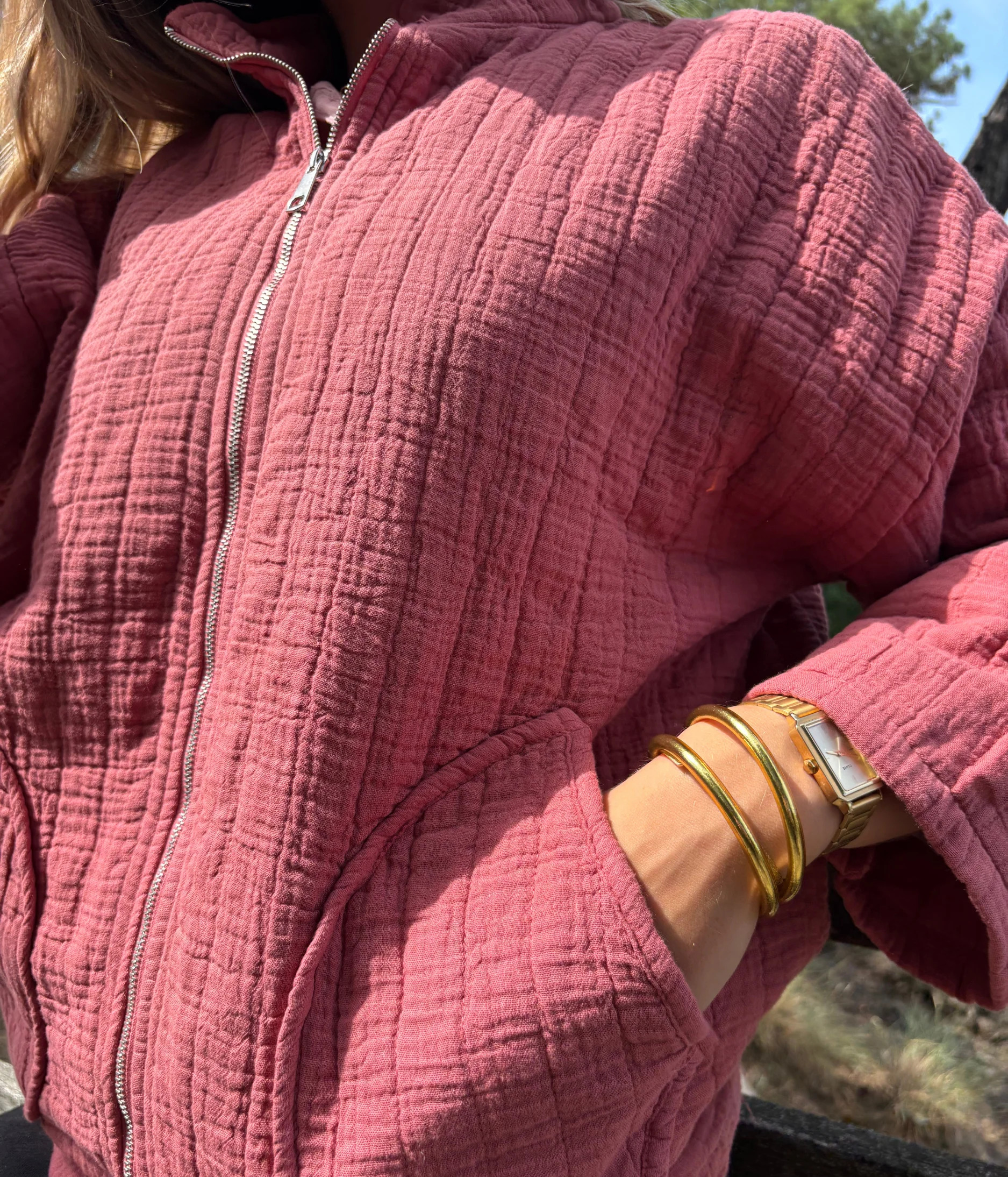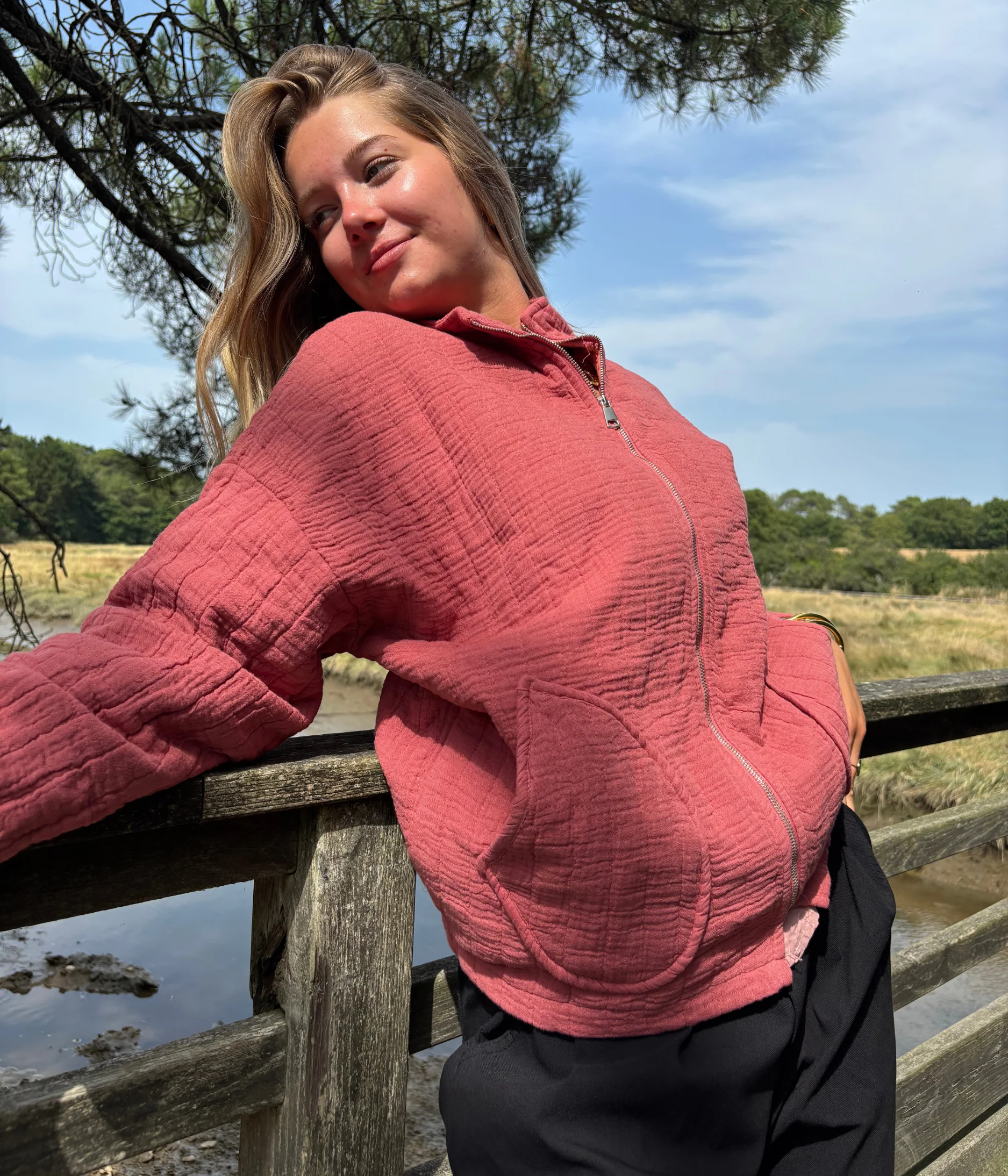 Cette veste femme en coton associe confort, chaleur et style décontracté. Sa texture matelassée apporte un effet cocooning tout en restant légère, parfaite pour la mi-saison ou pour superposer lors des journées plus fraîches. Sa coupe ample et son zip frontal en font une pièce pratique et facile à enfiler, idéale pour un look casual chic.